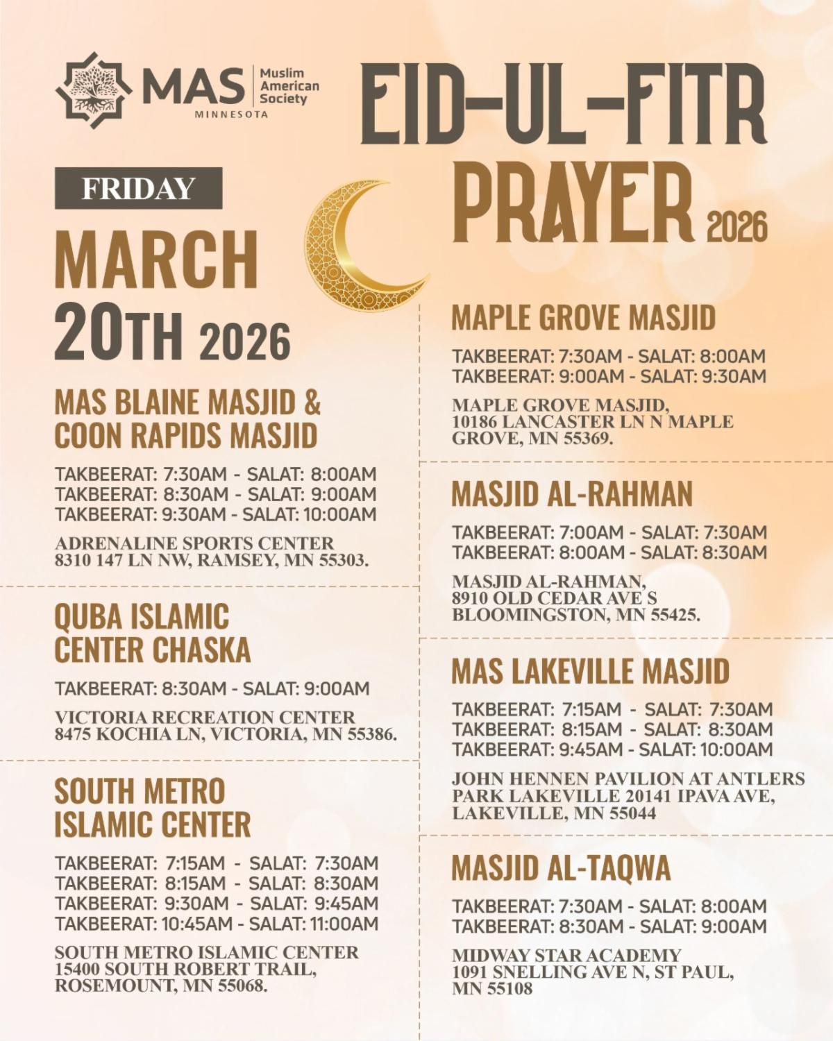 that uplifts the individual, the family, and the society. MAS MN operates seven Masjids in Minnesota. MAS MN provides religious programming and youth programs and organizes the annual Minnesota Muslim Convention and much more.